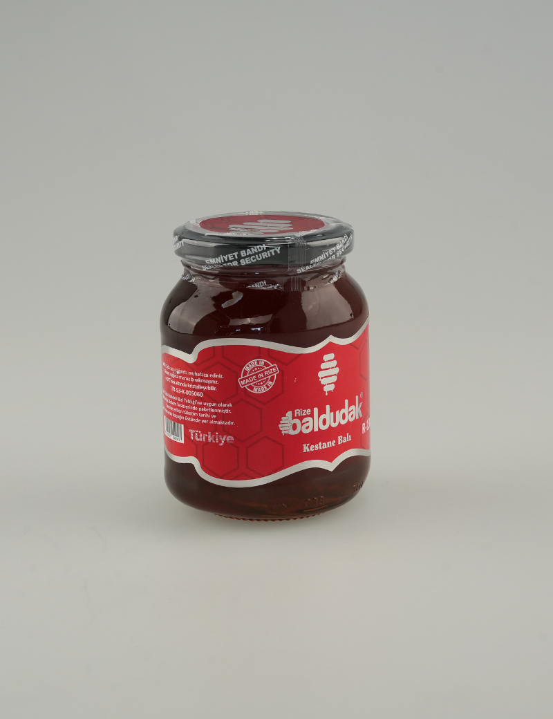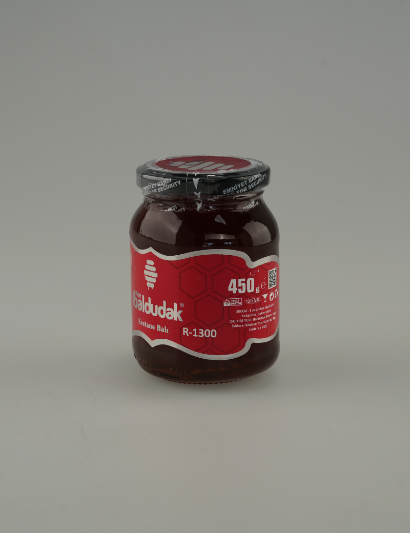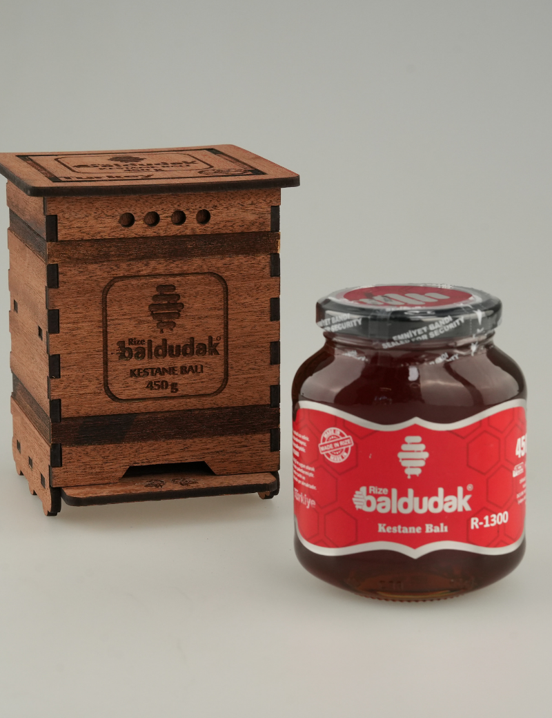 Görseldeki ahşap petek hediyesi sadece 450 gram ballarımızın yanında hediye olarak gönderilmektedir. Baldudak R-1300 Kestane ballarımız Rize’nin 1300 rakımlı yaylalarında, yerleşimden, kirlilikten, zirai ilaçtan, sanayiden ve araç trafiğinden uzak bölgelerde üretilmektedir ve dolum tesisimizde el değmeden şişelenmektedir. Bir arı kendi kursağını tam olarak doldurabilmesi amacıyla ortalama 1500 defa çiçek ziyaretinde bulunmaktadır. Bu anlamda 1 gram bal ise 180.000 çiçek ziyareti gibi oldukça zahmetli bir işlem sonucu oluşmaktadır. Baldudak kalitesiyle üretilen ürünlerimiz Rize İl Tarım Müdürlüğü Gıda Analiz Laboratuvarı'nda ve Ege Üniversitesi Argefar Özel Gıda Kontrol Laboratuvarı'nda analiz ve test edilmektedir. Tüm ürünlerimizde olduğu gibi bu ürünümüzde de şeker ve katkı maddelerinin oranı % 0,0’dır. Ürünlerimiz Türkiye Cumhuriyeti Tarım ve Orman Bakanlığı onaylıdır. Baldudak markamız Türk Patent ve Marka Kurumu tarafından tescillidir. Raf ömrü 5 yıldır.